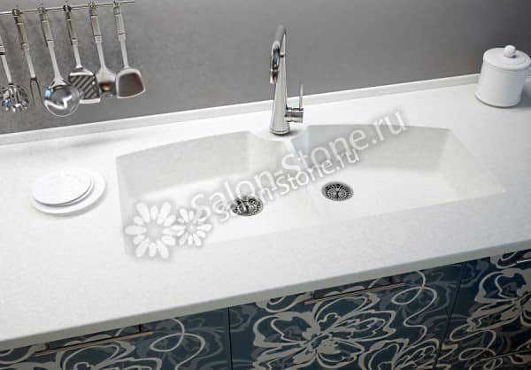Готовое изделие либо вклеивают снизу столешницы, либо вровень с ней, что способствует образованию целостной и единой ровной поверхности. Очень часто столешницу интегрируют с мойками из других материалов.